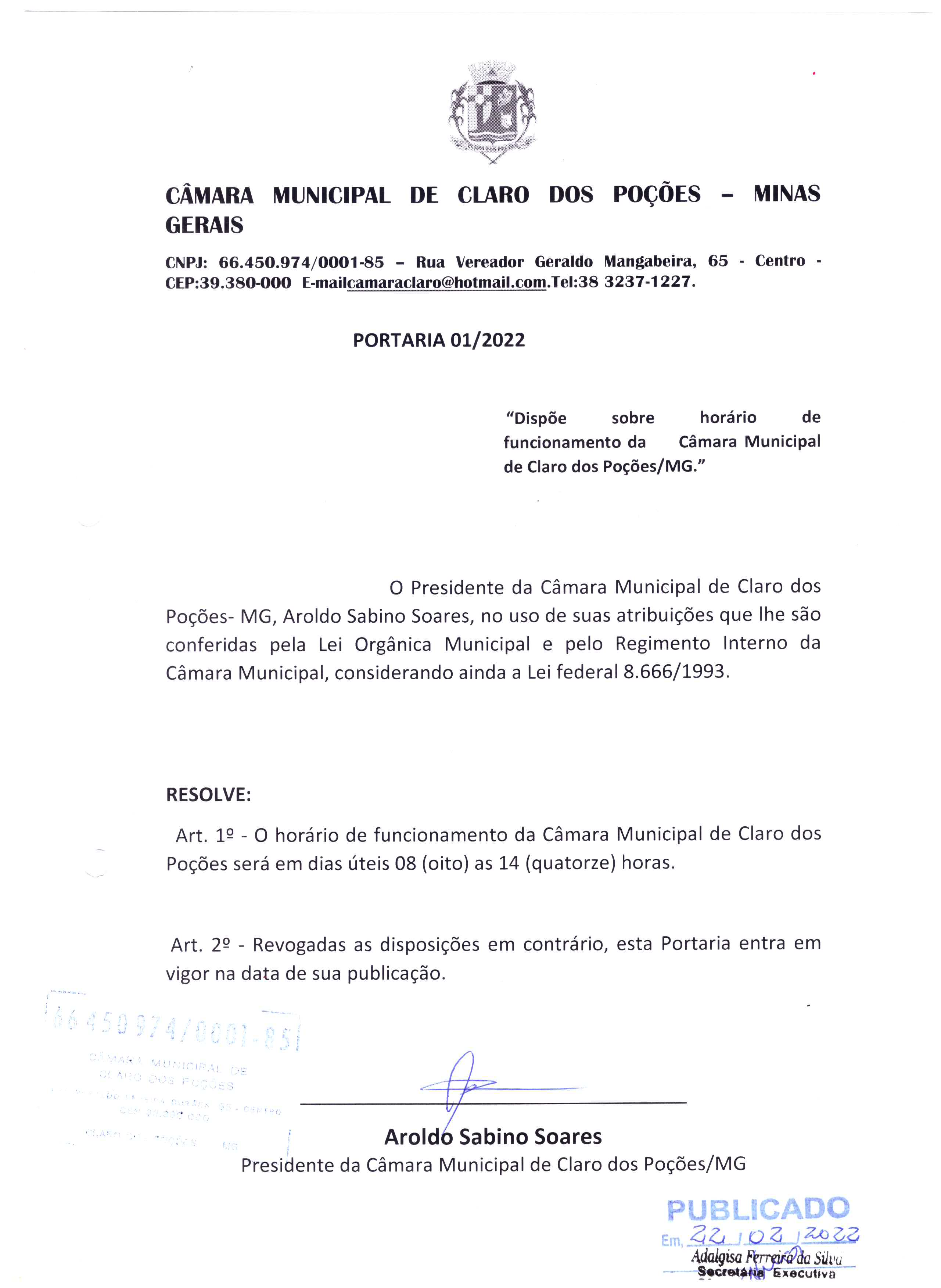 Dispõe sobre o horário de funcionamento da Câmara Municipal de Claro dos Poções - MG
